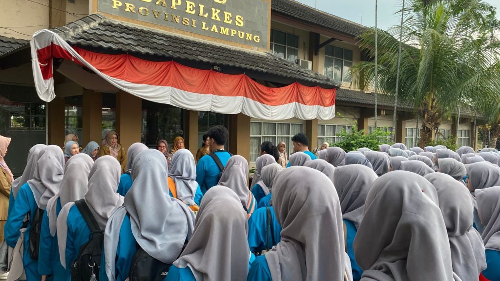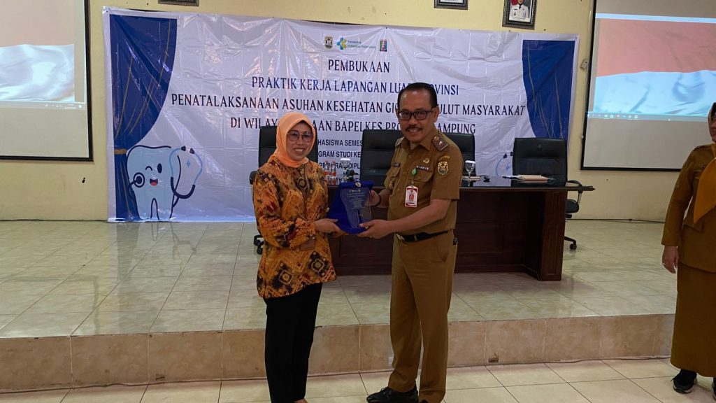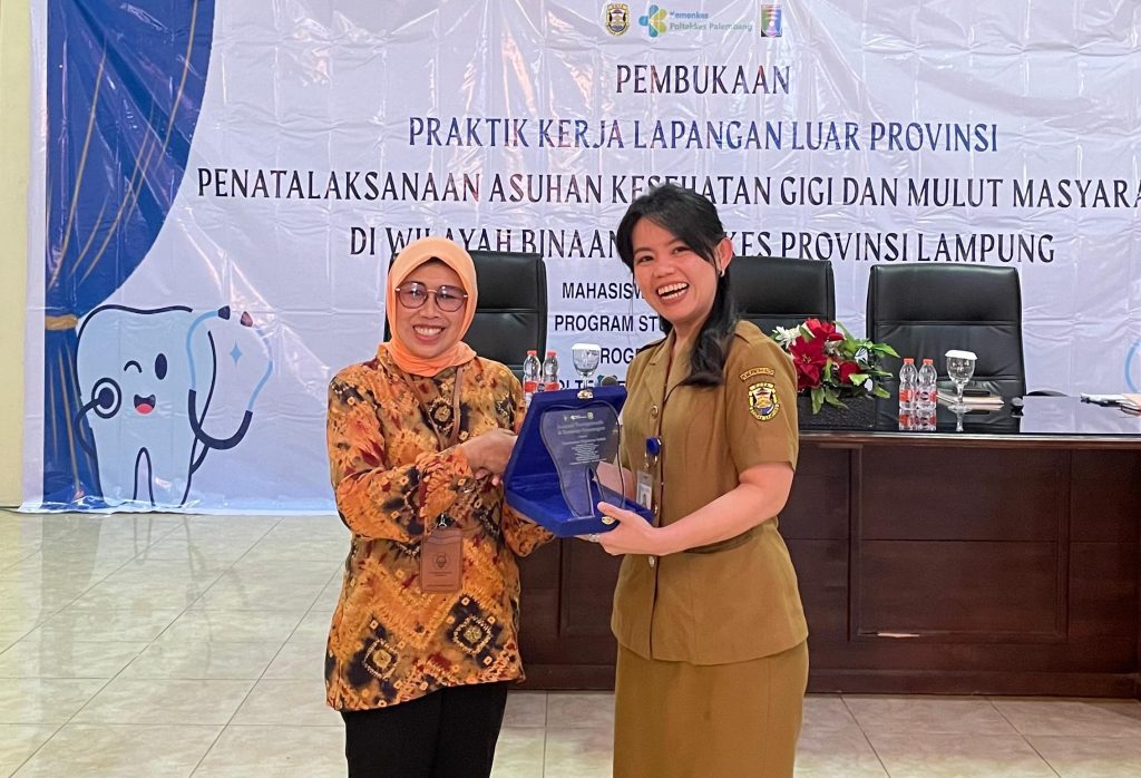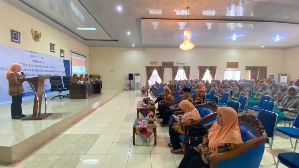 Lampung – 22 September 2025, Ketua Jurusan Kesehatan Gigi Poltekkes Palembang drg. Sri Wahyuni, M. Kes didampingi oleh para Dosen, Koordinator Akademik , PLP dan Tendik diantaranya drg. Meyrisa Bastari, M.Biomed, drg. Andrey Sastrawijaya, Gusretika Ramsih, M.Kes, Salsabila Erwani, AMd.Kes, Dian Anggareni, SE dan Erlan Jaya melakukan kegiatan Pembukaan PKL Luar Provinsi dengan sasaran utama Asuhan Kesehatan Gigi dan Mulut Masyarakat di Wilayah Bapelkes Provinsi Lampung yang diikuti oleh mahasiswa Semester V sebanyak 115 Mahasiswa.